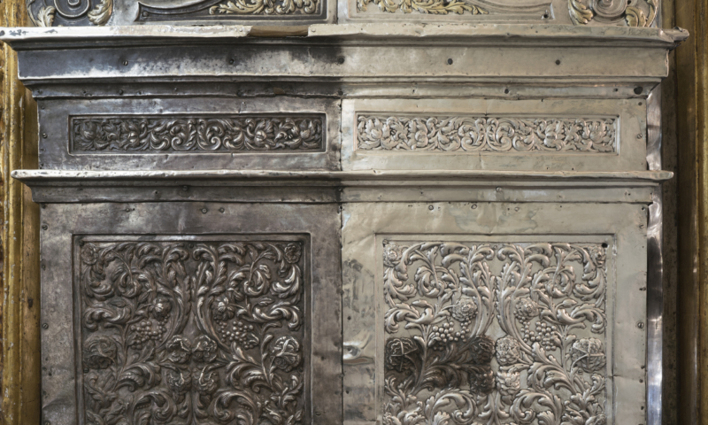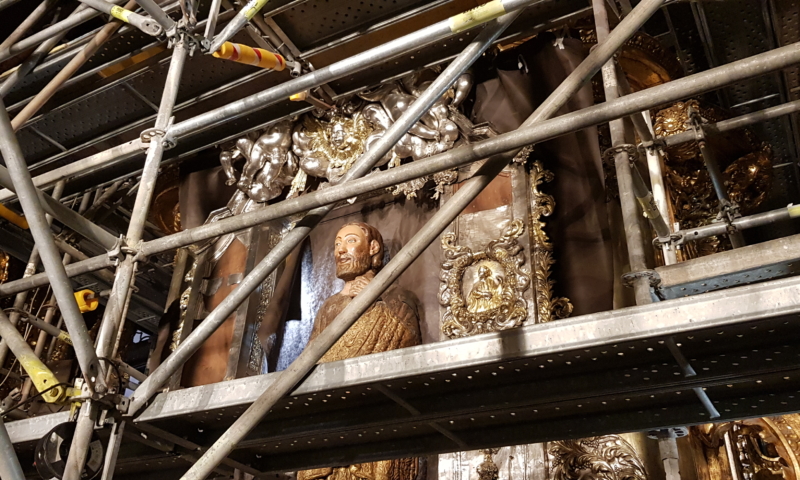 Los distintos elementos que conforman el altar y rejas de plata de la Capilla Mayor de la Catedral de Santiago de Compostela, ahora en proceso de restauración, se encuentran ubicados en el lugar más sagrado y emblemático de la basílica, impregnado de una fuerte carga místico religiosa desde sus orígenes. Se disponen directamente sobre el altar y frente a la capilla mayor, bajo el que se localiza la cripta que contiene los restos del Apóstol Santiago y de sus dos discípulos, Atanasio y Teodoro. El retablo es uno de los mayores altares metálicos del arte cristiano, enmarca y ensalza la figura del Apóstol y y recubre el camarín donde se encuentra en su trono, también de plata, la imagen de Santiago ubicada en ese lugar por el Maestro Mateo. El conjunto se compone de varios elementos, entre los que hay que destacar, por la riqueza y preciosismo en su decoración, el Sagrario, firmado y fechado por el platero salmantino Juan de Figueroa, en 1701. De alto valor artístico son el resto de elementos, como las gradas, el frontal de altar o la silla del apóstol. Están realizados en plata y plata sobredorada, montados sobre alma de madera. Objeto de la intervención, son también las rejas laterales, obra de Ángel y Jacobo Piedra, fechadas el año 1765, con balaustres de plata de considerable grosor, montados sobre bastidores de hierro, y crestería de plata relevada.